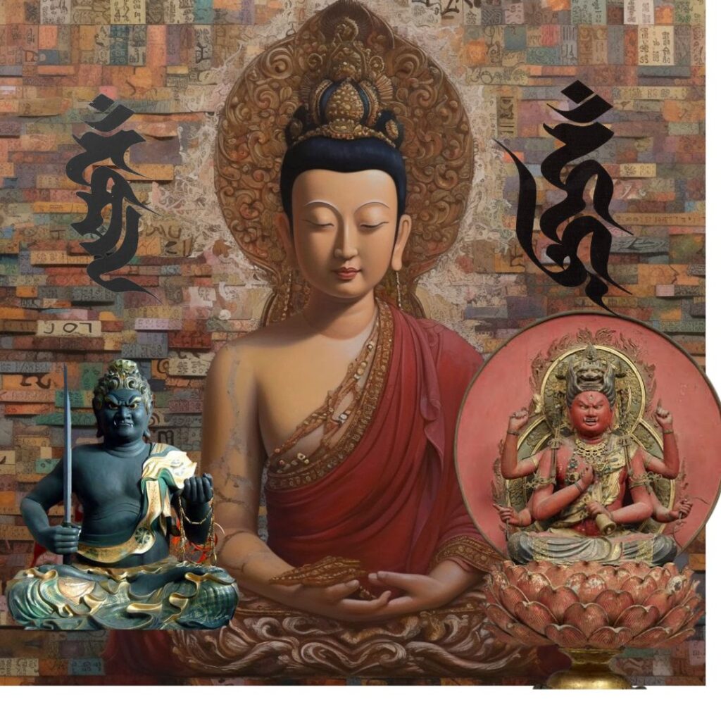1つの顔に2本の腕を持つ、菩薩形の像です。右手に剣、左手に如意宝珠を持っているのが一般的です。五仏宝冠を戴いた坐像として表現されます。