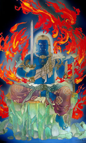 The bodhisattva who controls the wisdom of the Buddhas, as it is said to be the wisdom of Manjushri. He is a samurai on the left side of Shaka Nyorai, holding a wisdom sword in his right hand and a blue lotus flower in his left hand. Bringing universal enlightenment and wisdom