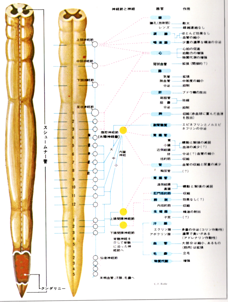 駄より出る上腸間膜動脈の起始部にある交感神経の大きい神経叢である。ここから出る神経は、 食道、胃腹部血管、肝輸胆管、膵臓、副腎、腸等に分布している。また、この神経叢は、大小内 臓神経、迷走神経、第十二胸神経節、第一腰神経節などが集まってできているので、この太陽神 経叢は、ひろく内臓臓器のすべてに大きな影響を持つのである』といっている。