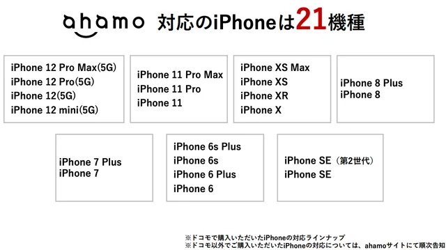 対応機種は、iOSがiPhone 6以降の全21機種。AndroidはGalaxyやXperia、AQUOS、arrowsシリーズなど全72機種です。なお、上記は『ドコモで購入した端末』を対象にしていて、ドコモ以外で購入したiPhoneやAndroid端末の対応はについては、動作確認が完了した機種からahamoサイトで順次告知します。
