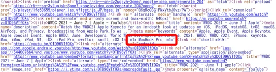 このタグは、WWDC 2021の基調講演が配信されているYouTubeのページにアクセスして、ブラウザの「ページのソースを表示」機能などを使うことで、実際に確認することができます。