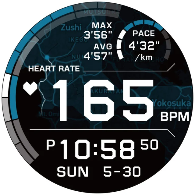 『CASIO』のプロ用登山スマートウォッチ「PRO TREK Smart」でも採用された「二層構造ディスプレイ」も本機の特徴です。この「二層構造ディスプレイ」は、時刻などの常時表示に適したモノクロ液晶と、地図・計測情報などを表示するリッチなカラー液晶を重ねたもの。用途によって表示するディスプレイを分けることで、最大1ヶ月のバッテリーライフを実現しています。