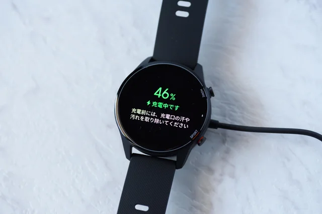 バッテリーの持ちは、公式では2時間で100%充電ができ、一般的な使用で9日間使えるとなっています(GPSスポーツモードは10時間)。これは何の問題もありません。