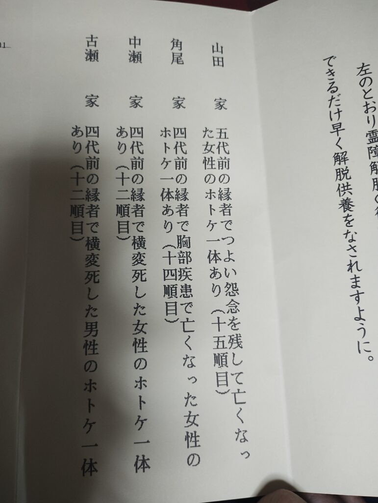 四代前の縁者で横変死した女性のホトケ一体あり(十二順目)