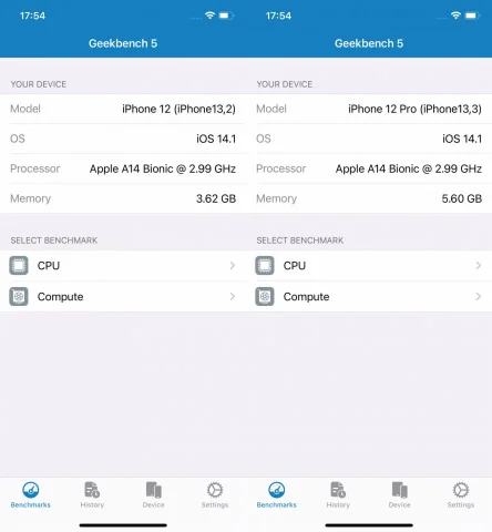 メモリ(RAM)の搭載量はいつもどおり公表されていないが、「Geekbench 5」のデバイス情報で確認したところ、iPhone 12は4GB、iPhone 12 Proは6GBを搭載していた。iPhone 12 miniは4GBの可能性が高いが、iPhone 12 Pro Maxにどのぐらいの容量のメモリが搭載されているのか気になるところだ。