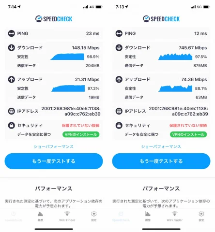 左が4G接続時で下り148.15Mbps、上り21.31Mbps、右が5G接続時で下り745.67Mbps、上り74.36Mbpsを記録した